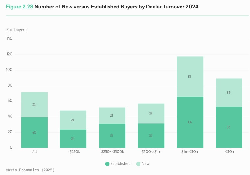 After broadening their base of buyers significantly over 2023, dealers with the highest turnovers in excess of $10 million pursued a more focused strategy in 2024, selling the highest-value works to a smaller group of collectors as the market at the high end became more challenging. However, even in this segment, dealers reported that 40% of their buyers were new to their business in 2024.(my emphasis)