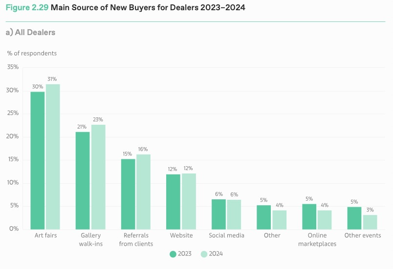 Notwithstanding the above, the news isn't all bad. According to the recently released 2025 UBS/Art Basel Art Market Report, some dealers have been successful in reaching new collectors. Some of these sales are due to new buyers coming into galleries. The other source of new buyers is through art fairs. One chart illustrates this: